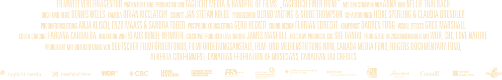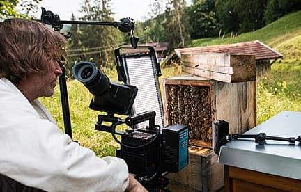 Die ganze Zeit wurden wir von Imkern und Bienenwissenschaftlern beraten, um die Chancen zu erhöhen, ein bestimmtes Verhalten auch drehen zu können. Nach zwei Jahren Drehzeitraum folgte dann ein Jahr Postproduktion. Aus unzähligen Stunden von Drehmaterial mussten zum Teil winzige Momente herausgesucht werden, die ein bestimmtes Verhalten zeigen. Wir haben immer versucht, nicht nur den Ablauf der Ereignisse korrekt wiederzugeben, sondern auch nah an unserer Haupt- figur – der einen Biene – zu bleiben.