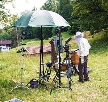 Brian baute auch eine Konstruktion, die uns erlaubte, die Kamera mit einer Fernbedienung zu steuern, denn bei Makroaufnahmen überträgt sich sogar der Pulsschlag des Kameramanns auf die Kamera, wenn er sie anfasst, verwackelt die Aufnahme. Wir verwendeten auch ein spezielles Makroobjektiv, das eher für die Forschung als für das Filmemachen entwickelt wurde und vieles mehr. Eine unserer größten Herausforderungen war das Filmen auf ‚Augenhöhe‘ mit den Bienen. Filmemacher meiden diese Perspektive normalerweise, denn wenn Sie eine Wabe aus der Perspektive einer Biene betrachten, sehen Sie nicht viel – nur unzählige Bienen.